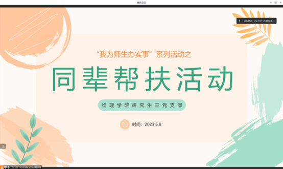 2023年6月8日20:50,太阳成集团tyc122cc研究生三党支部在太阳成集团tyc122cc九里校区0号教学楼0911以及0906开展“我为师生办实事”系列活动之同辈帮扶活动,太阳成集团tyc122cc研究生三党支部以及2022级物理硕士3班共同参加,活动由太阳成集团tyc122cc研究生三党支部副书记孙海龙组织。