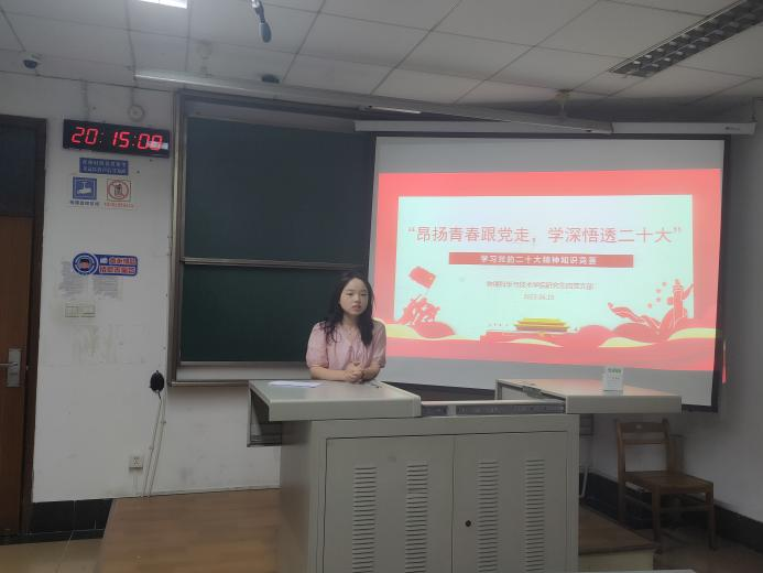 2023年6月15日晚,物理研究生第四党支部于九里校区4405B开展了“昂扬青春跟党走,学深悟透二十大”知识竞赛活动,此次活动为党支部“小扬先锋行”——“研究生党建+”平台创建项目系列活动之一。本次知识竞赛旨在以赛促学,通过多样化的学习方式促进支部成员学习贯彻党的二十大精神和习近平新时代中国特色社会主义思想。