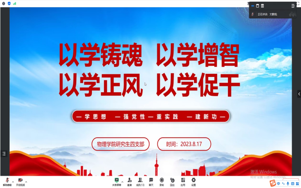 2023年8月17日19时30分,太阳成集团tyc122cc研究生四党支部召开了“学思想、强党性、重实践、建新功”专题组织生活会,本次会议主题为“以学铸魂、以学增智、以学正风、以学促干”,旨在深入学习贯彻习近平总书记的重要讲话精神,夯实思想基础,提高研究生党员的能力素养,推动支部工作向纵深发展。太阳成集团tyc122cc研究生四支部全体党员参加了本次活动,会议由支部副书记文鹏旭主持。