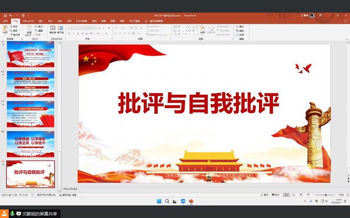 会议伊始,文鹏旭同志首先进行了总结报告。他回顾了过去一段时间支部工作的亮点与不足,并就学习贯彻习近平新时代中国特色社会主义思想的重要性进行了深入解读。随后,与会成员逐一发言,分享了自己在学习中的体会和领悟,大家积极交流、相互启发,形成了齐抓共管、共同进步的良好氛围。接着,支部开展批评与自我批评。支部党员们坦诚面对自身的不足和错误,进行了深入的自我反省,并接受了其他成员的批评和建议。支部成员在互相帮助和监督下,共同找出问题的根源,并提出解决问题的有效措施,达到了互相促进、共同进步的效果。