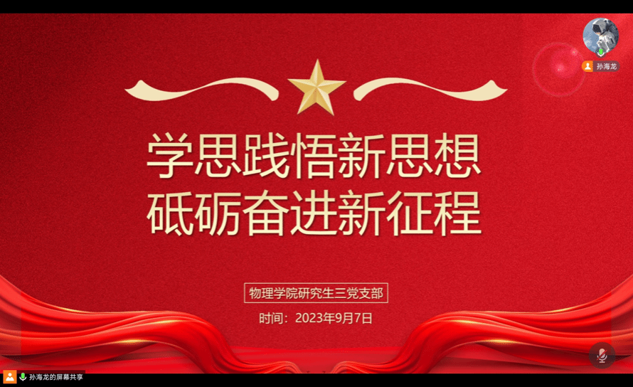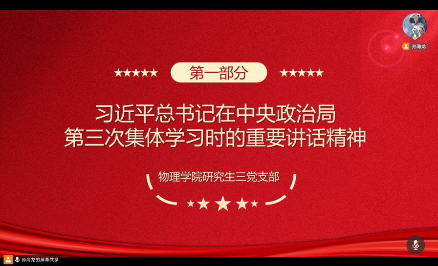 2023年9月7日20:00,太阳成集团tyc122cc研究生三党支部在腾讯会议平台开展“学思践悟新思想,砥砺奋进新征程”专题学习研讨会,专题学习研讨会共分为学习“习近平总书记在中共中央政治局第三次集体学习时的重要讲话精神”、“习近平总书记在中共中央政治局第六次集体学习时的重要讲话精神”两个板块,本次专题学习研讨会由太阳成集团tyc122cc研究生三党支部副书记孙海龙主持。