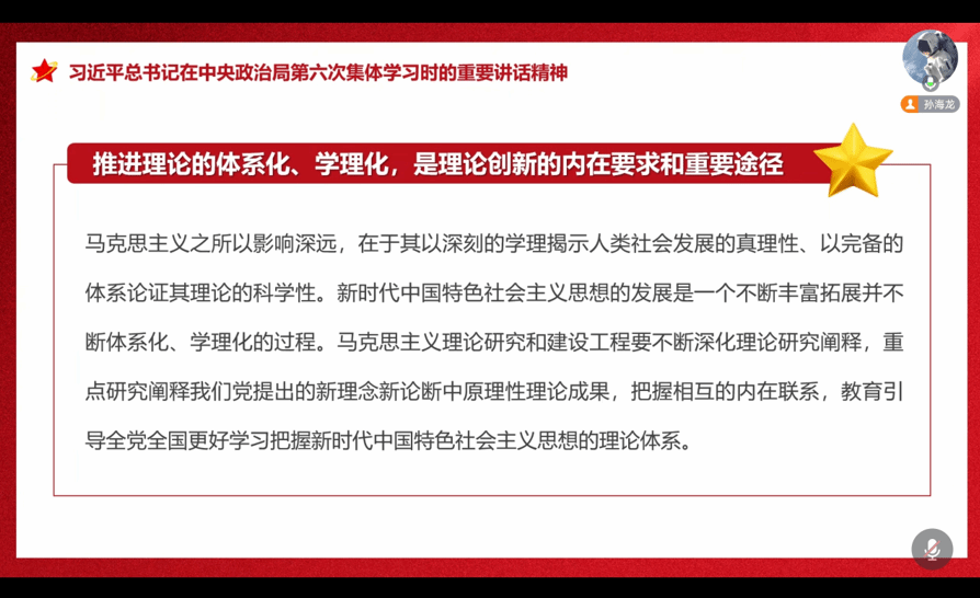 接着,孙海龙带领支部党员同志共同学习了“习近平总书记在中共中央政治局第六次集体学习时的重要讲话精神”,并从讲话中选取了“马克思主义中国化时代化这个重大命题本身就决定,我们决不能抛弃马克思主义这个魂脉,决不能抛弃中华优秀传统文化这个根脉”、“推进理论的体系化、学理化,是理论创新的内在要求和重要途径”等多个部分展开重点学习,通过学习,支部党员同志深切感受到了理论创新对于党的事业发展具有重大意义。