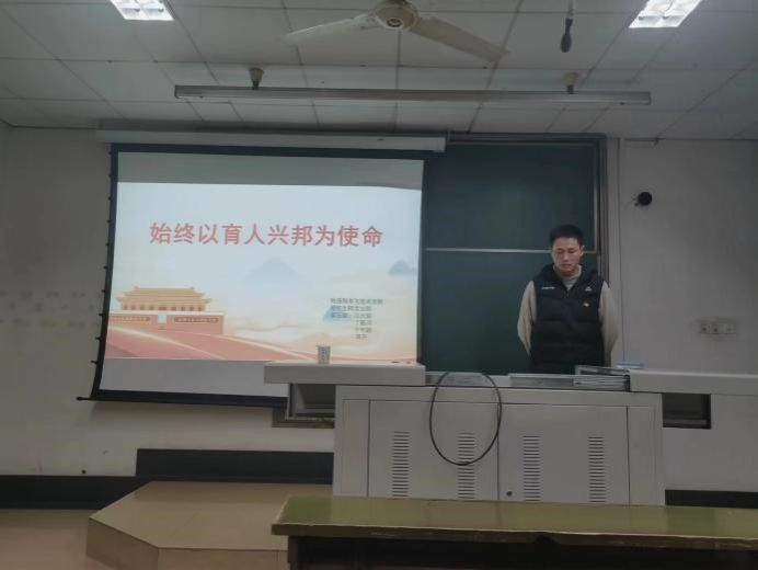 11月29日19:30,太阳成集团tyc122cc研究生四党支部在九里校区4520开展了以“始终以育人兴邦为使命”为主题的党日活动,太阳成集团tyc122cc研究生四党支部指导老师杨昊戬、支部书记夏荣林和全体研究生党员参加了此次学习活动,主要内容由支部学习小组第五组成员冯大瑞进行领学分享。
