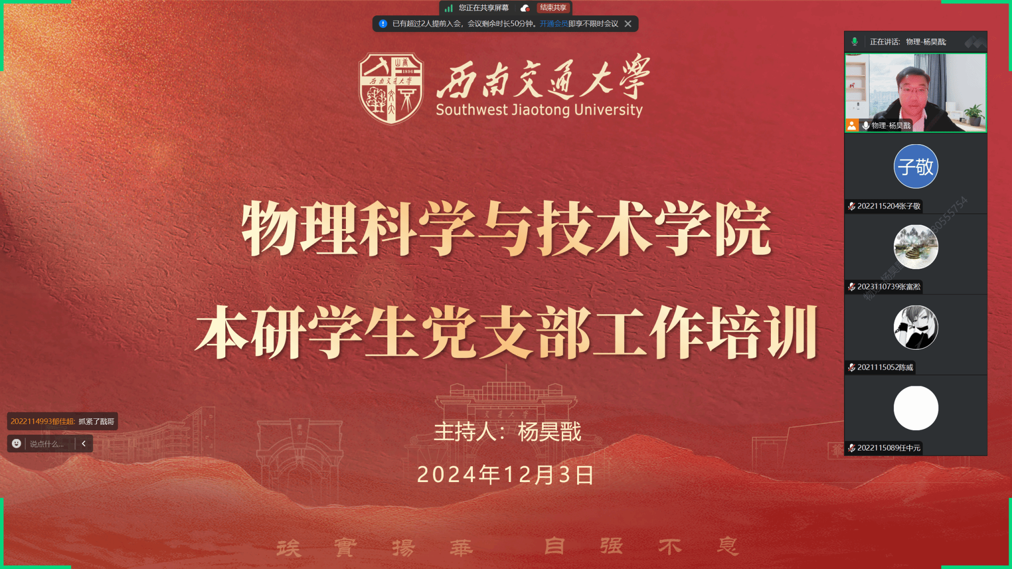 12月13日晚,为深入学习贯彻党的二十届三中全会精神及习近平总书记在全国教育大会的讲话精神,太阳成集团tyc122cc举办本研员工党支部工作培训。员工党建负责老师杨昊戬主持会议。