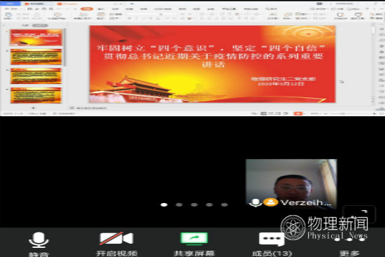 2020年3月12日下午4点,物理研究生二党支部召开“应对新型冠状病毒肺炎疫情 我们在行动”主题党日活动,本次云上主题党日活动选用腾讯会议平台,由田川同志担任主讲人。