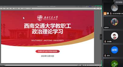 物理系教工党支部的全体党员于2020年12月10日下午4:00-5:00利用腾讯会议APP开展了主题党日活动,学习贯彻中共四川省委十一届八次全会精神。会议由物理系党支部书记、系副主任朱浩同志主持。