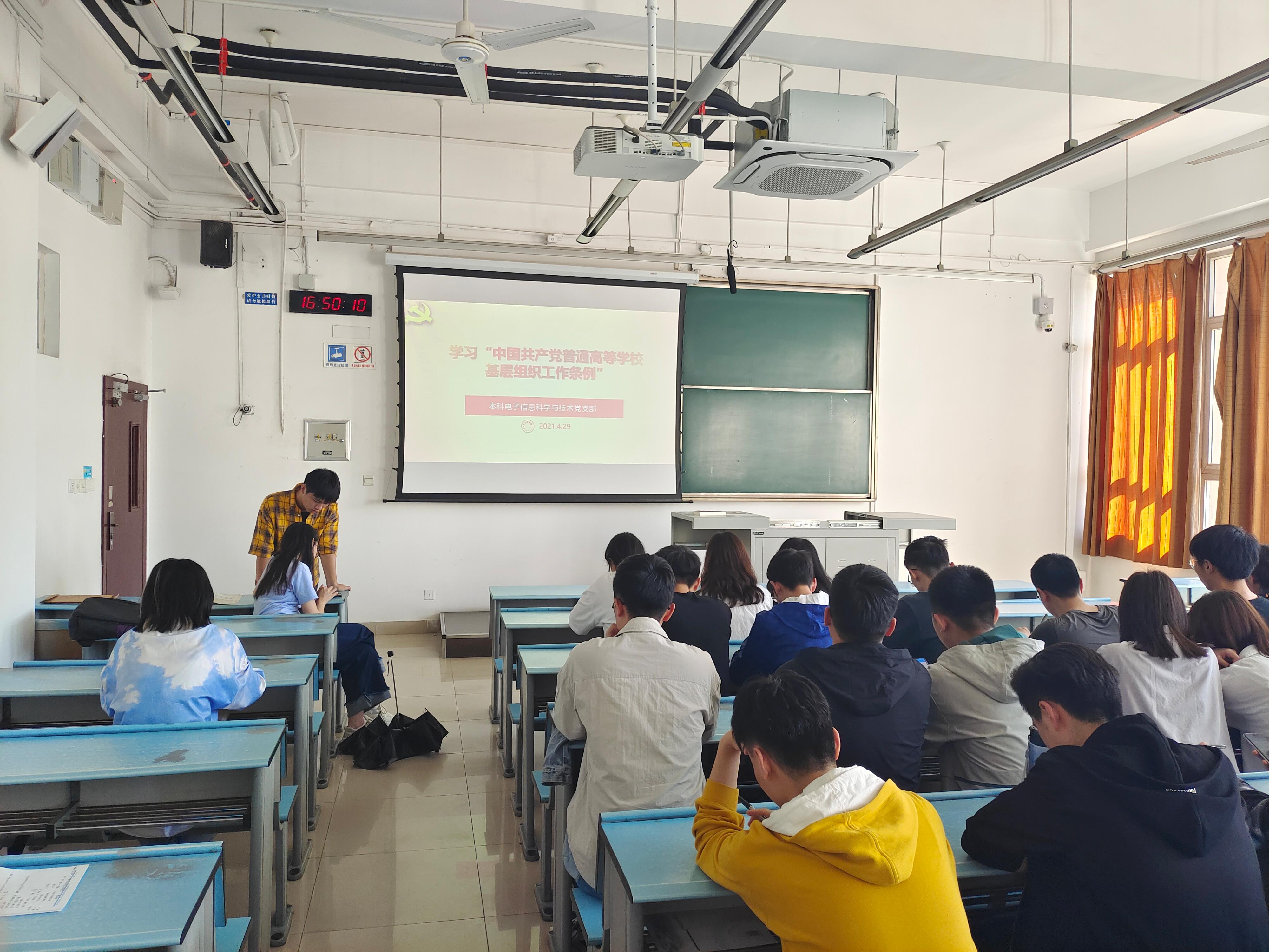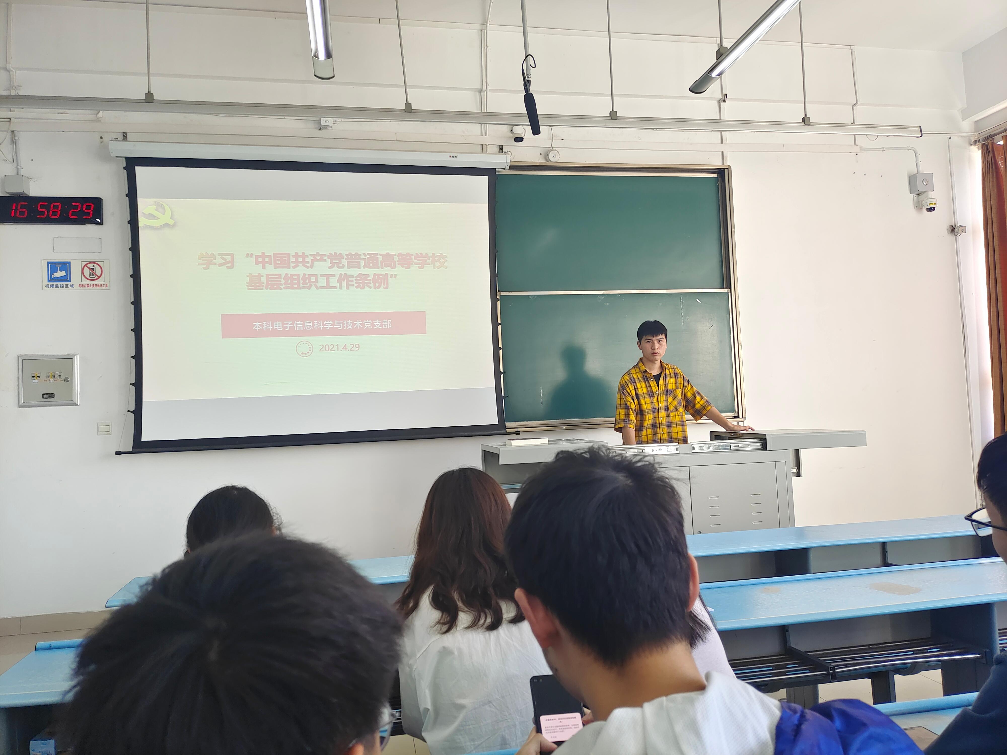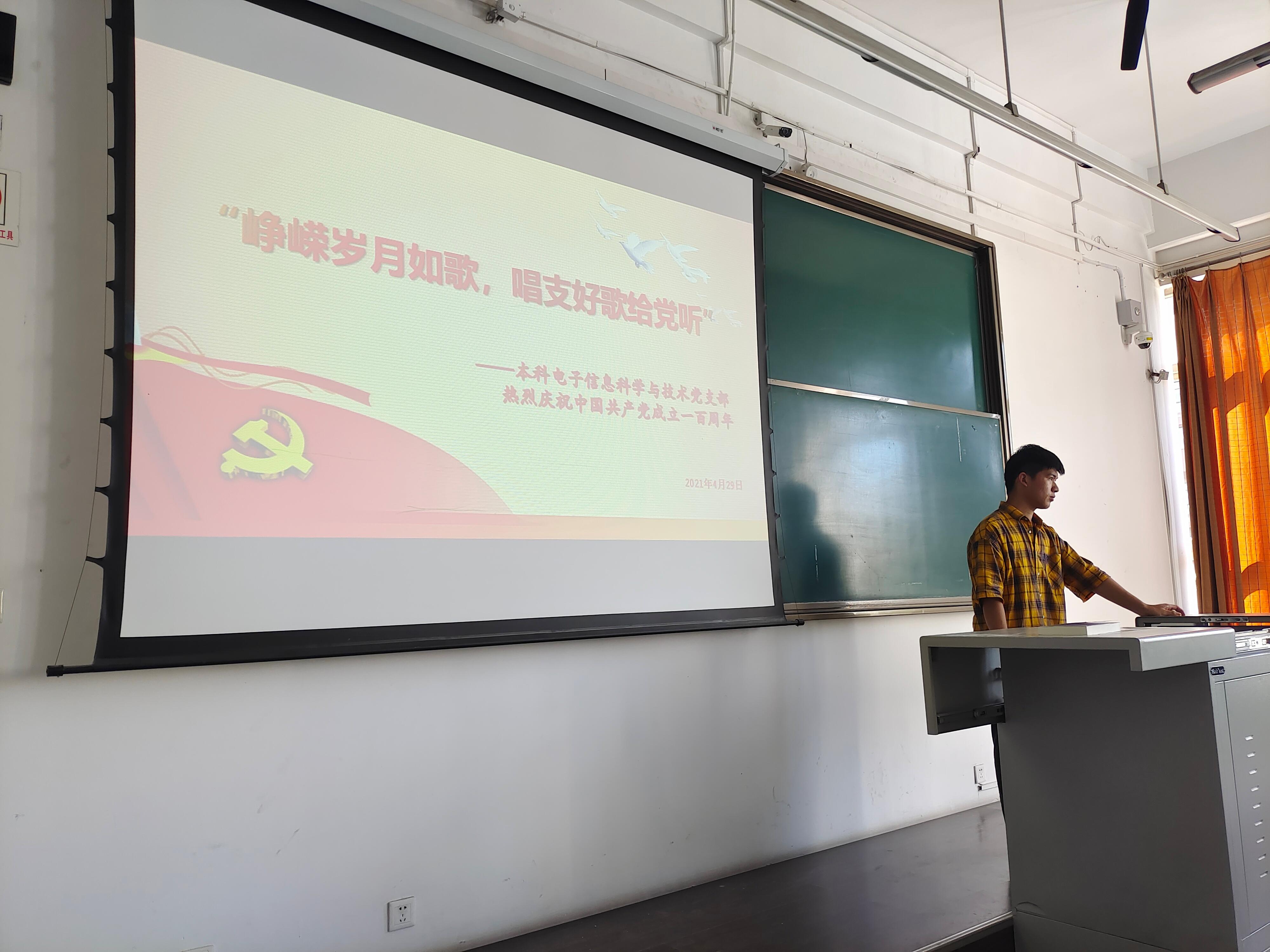 2021年4月29日16:00,太阳成集团tyc122cc本科电子信息科学与技术党支部于犀浦校区X2433举行了“峥嵘岁月如歌,唱支好歌给党听”暨学习《中国共产党普通高等学校基层组织工作条例》党日活动。此次活动由支部书记郭畅同志主持,党支部全体党员同志参加。