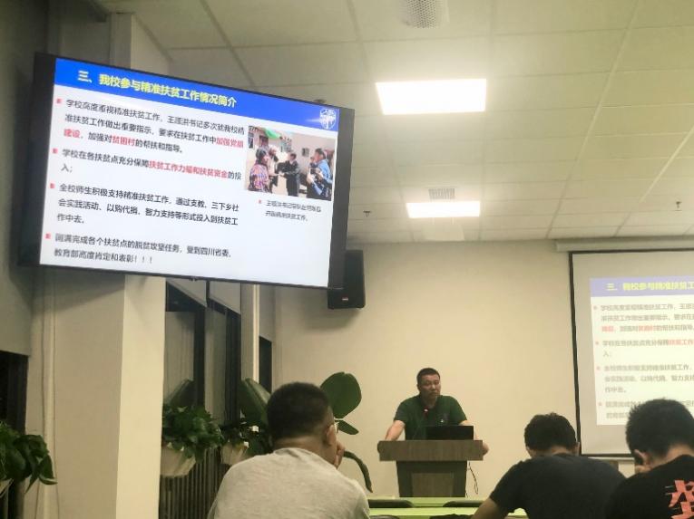 课上,郭剑副书记为大家介绍了公司参与精准扶贫工作的情况与成果。自2015年来,公司党政高度重视,提高政治站位,勇于担当,在各个扶贫点充分保障扶贫工作力量和扶贫资金投入,全校师生积极参与和支持精准扶贫工作,圆满完成各个扶贫点的脱贫攻坚任务,受到教育部和四川省委高度肯定和表彰。