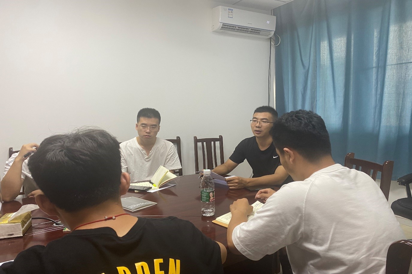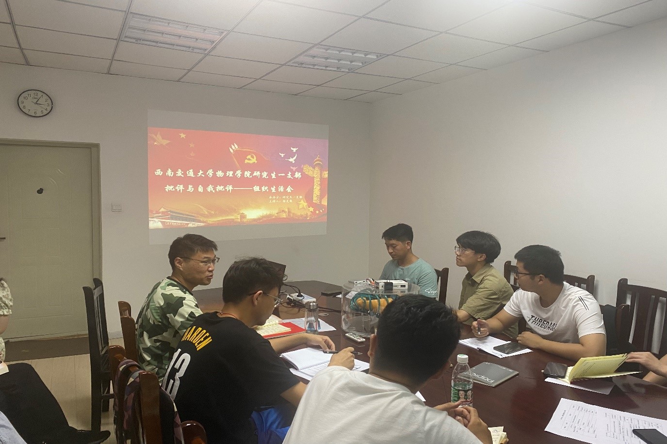 2021年7月6日16:00时,物理研究生一党支部于九里校区0903室开展“找差距 补短板 齐进步”专题组织生活会,物理研究生一党支部书记门满洲、副书记杨昊戬同志、宣传委员方茜同志、组织委员李江伟同志、学习委员崔子麟同志及支部党员参加了本次会议。会议由党支部书记门满洲同志主持。