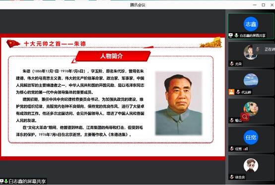 白志鑫同志详细地介绍了十大元帅之首—朱德同志的伟大事迹和生平经历。朱德,原名朱代珍,中华人民共和国的开国元勋,是以毛泽东同志为核心的党的第一代中央领导集体的重要成员。解放战争中,朱德同志参与制定了“向北发展,向南防御”等一系列重大战略决策,协助毛泽东同志指挥各解放区军民,先后粉碎国民党反动派的全面进攻和重点进攻。朱德同志亲自指导解放石家庄战役,为组织夺取大中城市的攻坚战积累了宝贵经验。在战略决战和战略追歼阶段,朱德同志协助毛泽东同志,指挥人民解放军彻底推翻了国民党反动派在中国大陆的统治,领导我们党团结全国各族人民建立了中华人民共和国。新中国成立后,朱德同志不顾年事已高,为我国社会主义制度的建立和各项建设事业的发展,作出了重要贡献。朱德同志是第一任党的中央纪律检查委员会书记,对党的纪律检查工作倾注了大量心血,做了大量奠基性工作,为在执政条件下加强党纪党风建设积累了重要经验。朱德同志十分重视国防现代化建设,在人民军队革命化、正规化建设和各军兵种创建发展、军事院校建设、部队教育训练等方面,作出了重要贡献。