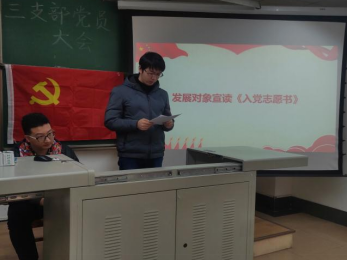 接着,魏溢宏、张经纬、朱蕴齐、郝宇昕、项松五名发展对象按照顺序宣读了《入党志愿书》。然后,入党介绍人介绍了发展对象的有关情况,支委会向支部大会汇报了对发展对象的审议情况,与会党员发表了相应的意见。与会党员对是否接收该发展对象成为预备党员进行了投票表决,发展对象作了表态发言,此举更加端正了他们的入党动机。