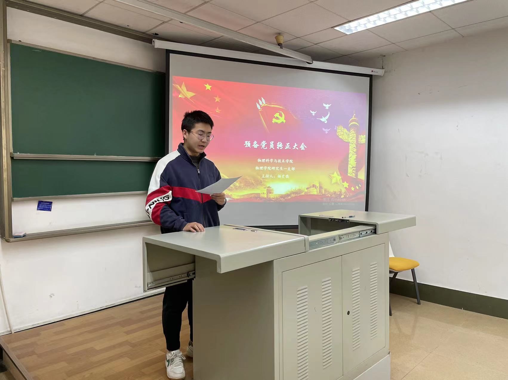 最后,支部副书记杨昊戬同志对新接收的预备党员提出要求,希望各位党员同志严于律己,时刻端正自身政治立场,时刻以共产党员标准规范自身言行,不忘入党初心,不负党员使命,不断挑战自我并战胜自我。