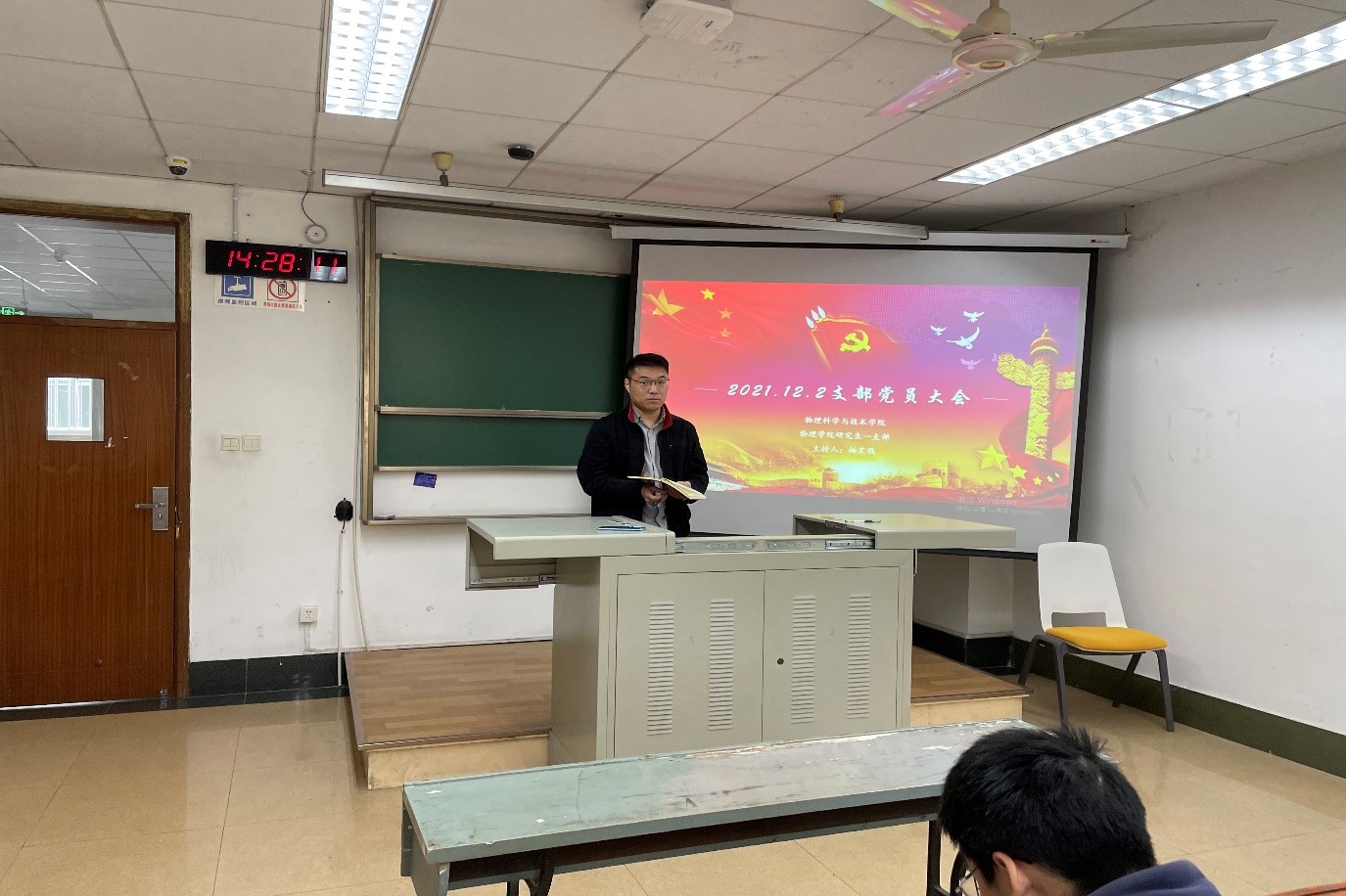 2021年12月2日14:00时,中共太阳成集团tyc122cc研究生一党支部召开支部党员大会,物理研究生一支部副书记杨昊戬同志、宣传委员方茜同志、组织委员李江伟同志、学习委员崔子麟同志及支部党员参加了本次会议。会议由党支部副书记杨昊戬同志主持。