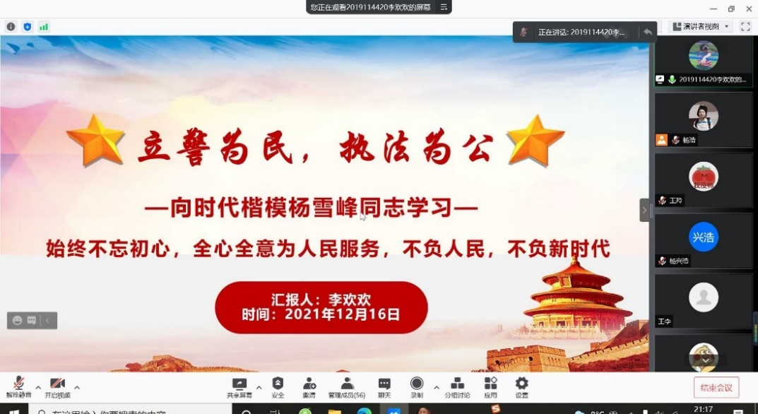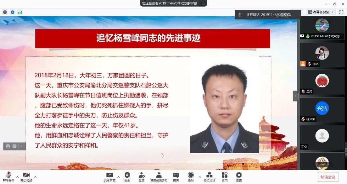 随后,李欢欢同志进行了“立警为公,执法为民”——向时代楷模杨雪峰同志学习的主题分享。杨雪峰同志生前为重庆市公安局渝北分局交巡警支队石船公巡大队副大队长2018年2月18日,杨雪峰在执行春运交通安保任务中突遭暴力袭击,与犯罪嫌疑人英勇搏斗,因伤势过重不幸牺牲,年仅41岁。在从警的20余年中,他始终不忘初心、牢记使命,扎根基层、奋战一线,不怕工作辛苦,不嫌岗位偏远,坚决服从组织安排。2018年8月27日,中央宣传部向全社会发布杨雪峰先进事迹,宣读了《中共中央宣传部关于追授杨雪峰同志“时代楷模”称号的决定》,追授他“时代楷模”称号。