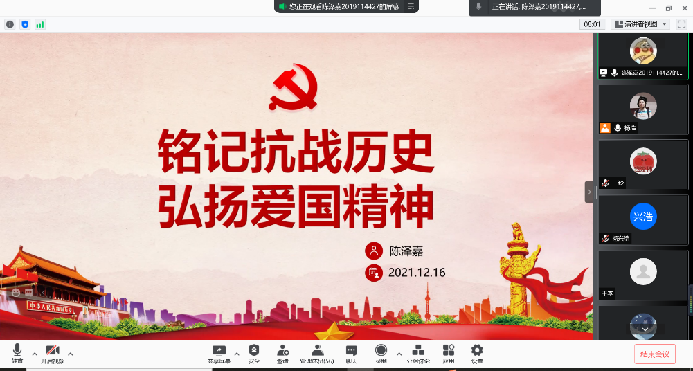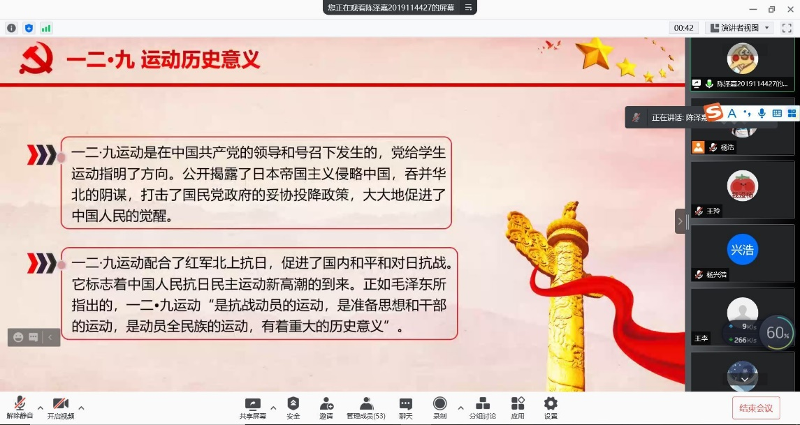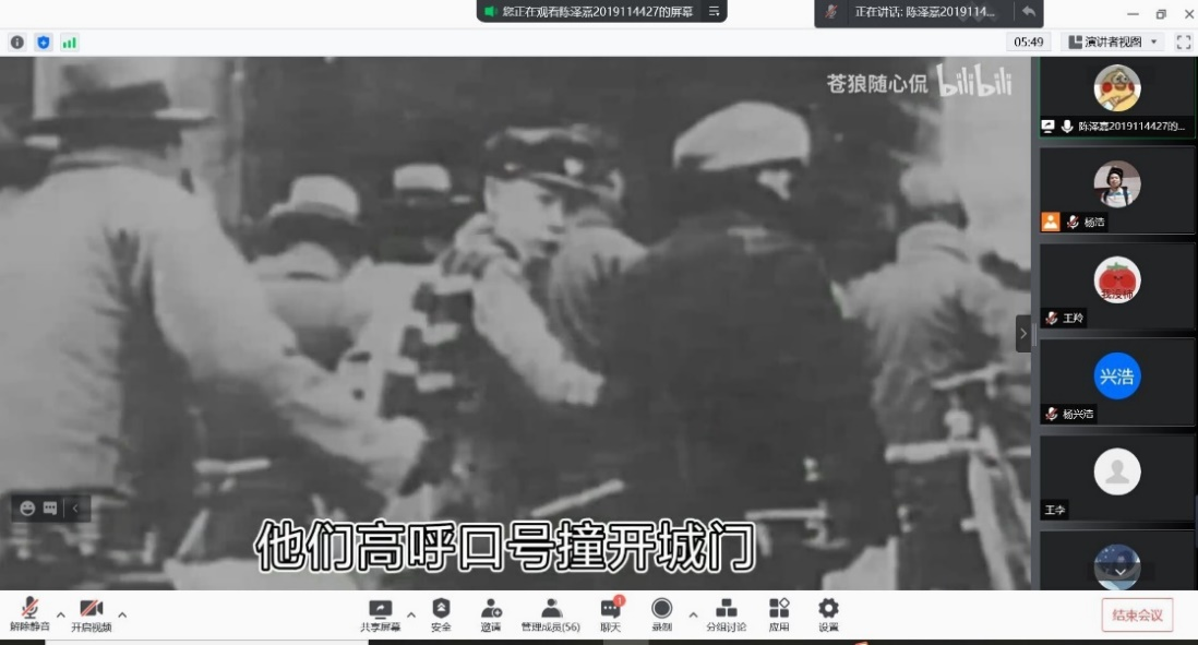 在最后陈泽嘉同志进行分享视频,对于“一二·九”运动有了更为详细阐述,使得我们对于其精神及启示也有了更为明确的理解。