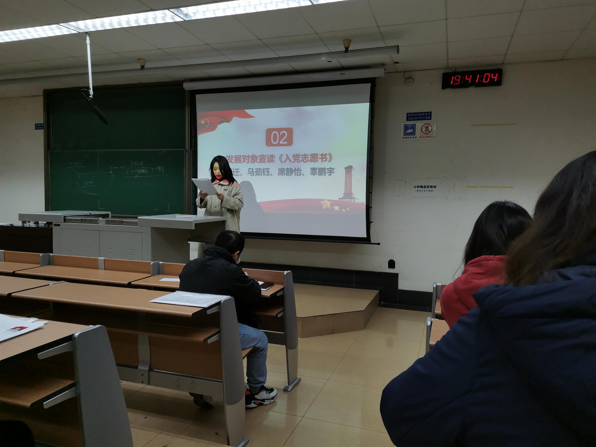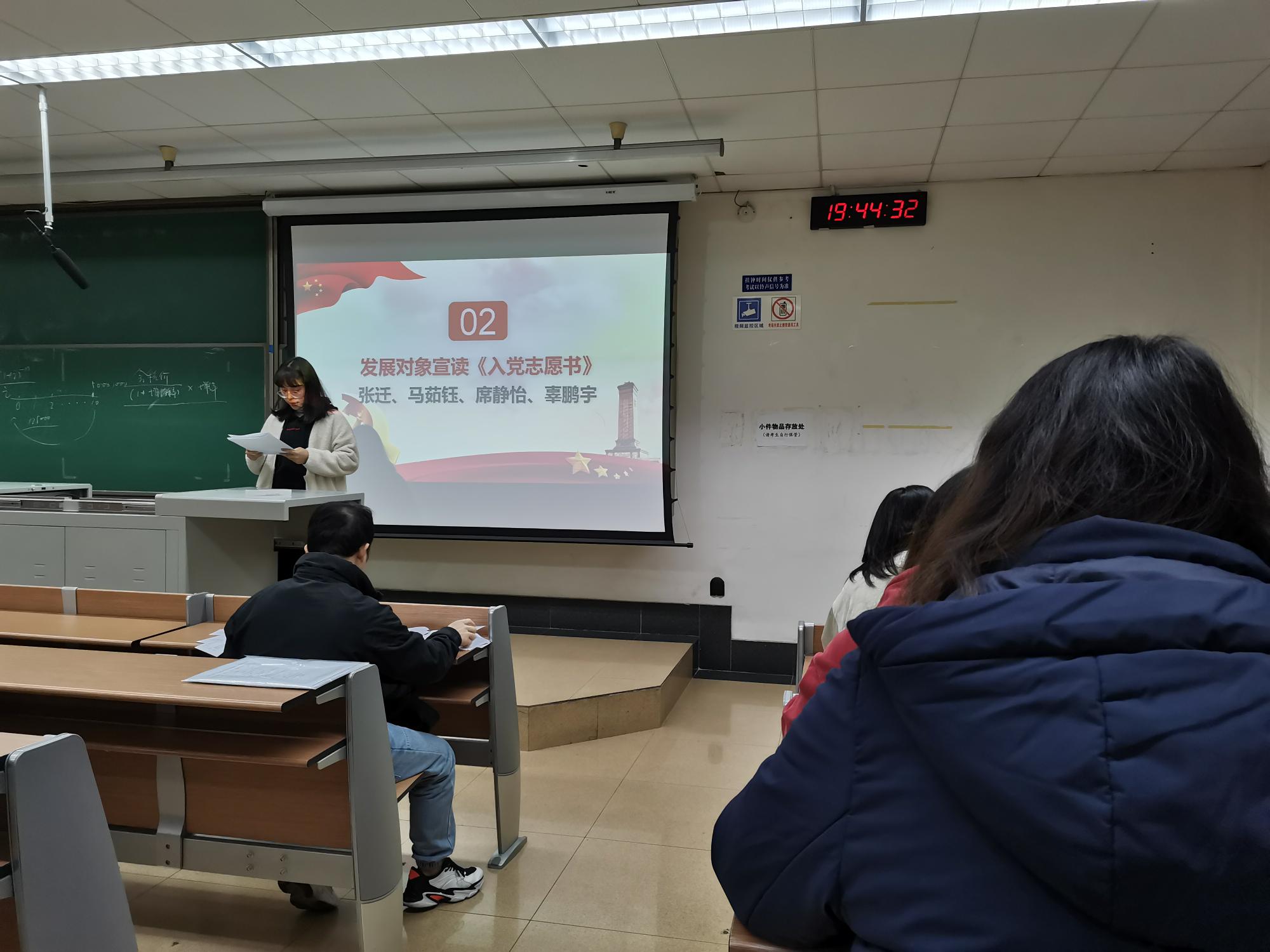 经过支委会的讨论,秦荣荣同志宣读了同意接收张迁、马茹钰、席静怡、辜鹏宇为预备党员的意见,并对四位同志表示衷心祝贺、提出严格要求并给予了殷切希望。四位同志也进行了表态,承诺在以后的学习工作中会不断追求卓越,以优秀共产党员标准严格要求自己。最后,在全体党员同志的热烈的掌声中,本次大会圆满落幕。