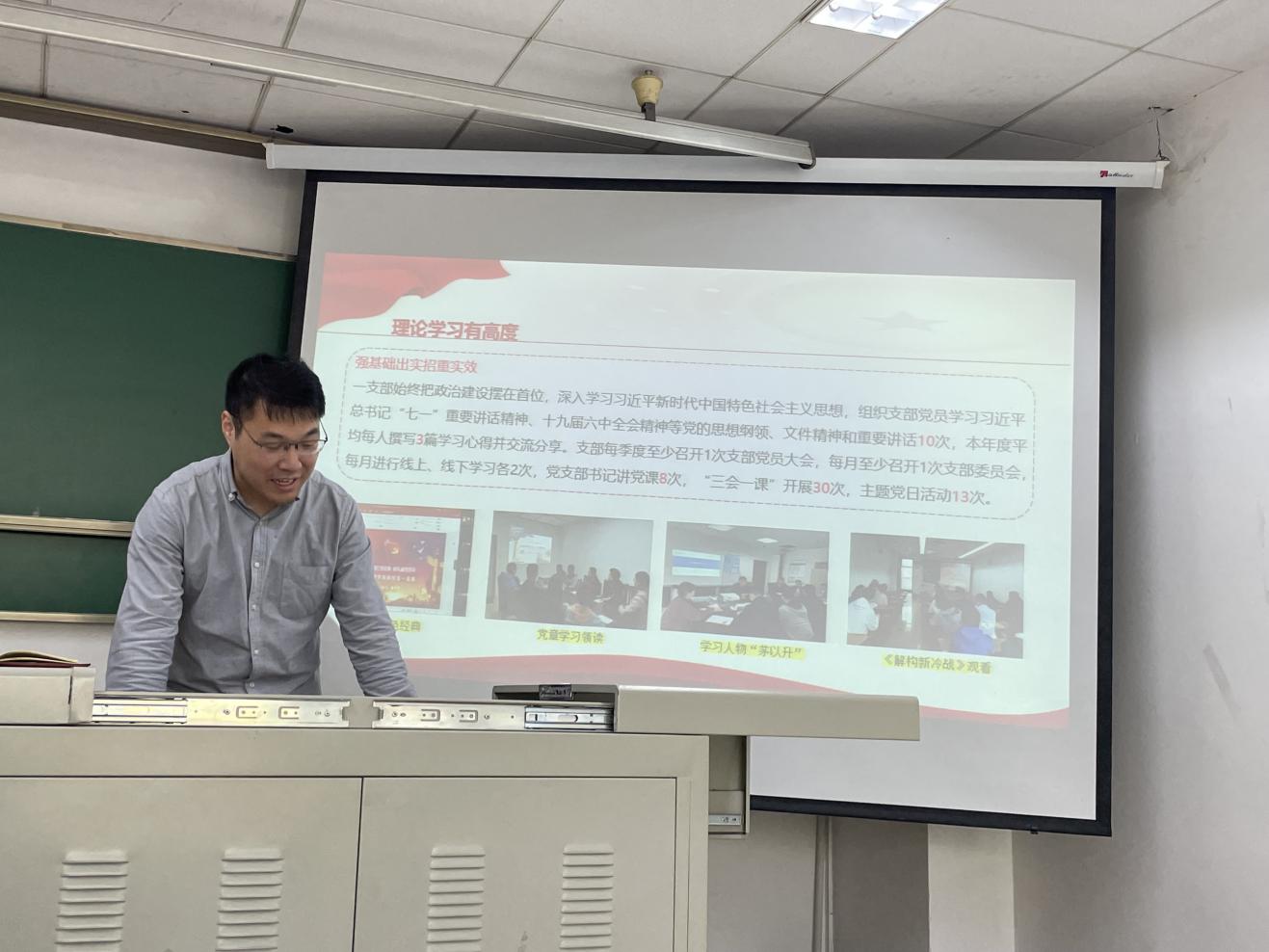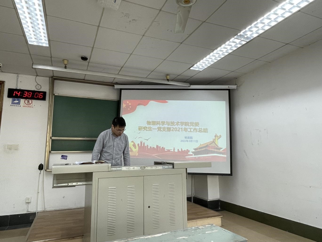 杨昊戬同志总结2021年党支部的工作情况,首先对支部同志一直以来的积极工作表示感谢,同时也提出支部存在的一些问题,如:对党员的思想动态监督还不够完善、部分党员的理论水平结构还不够健全、部分党员的科研模范作用还不够突显等。希望能组织支部党员多做社区公益、志愿服务等实践活动,将科研学习融入到支部年度计划中,提升支部党员学术科研能力。