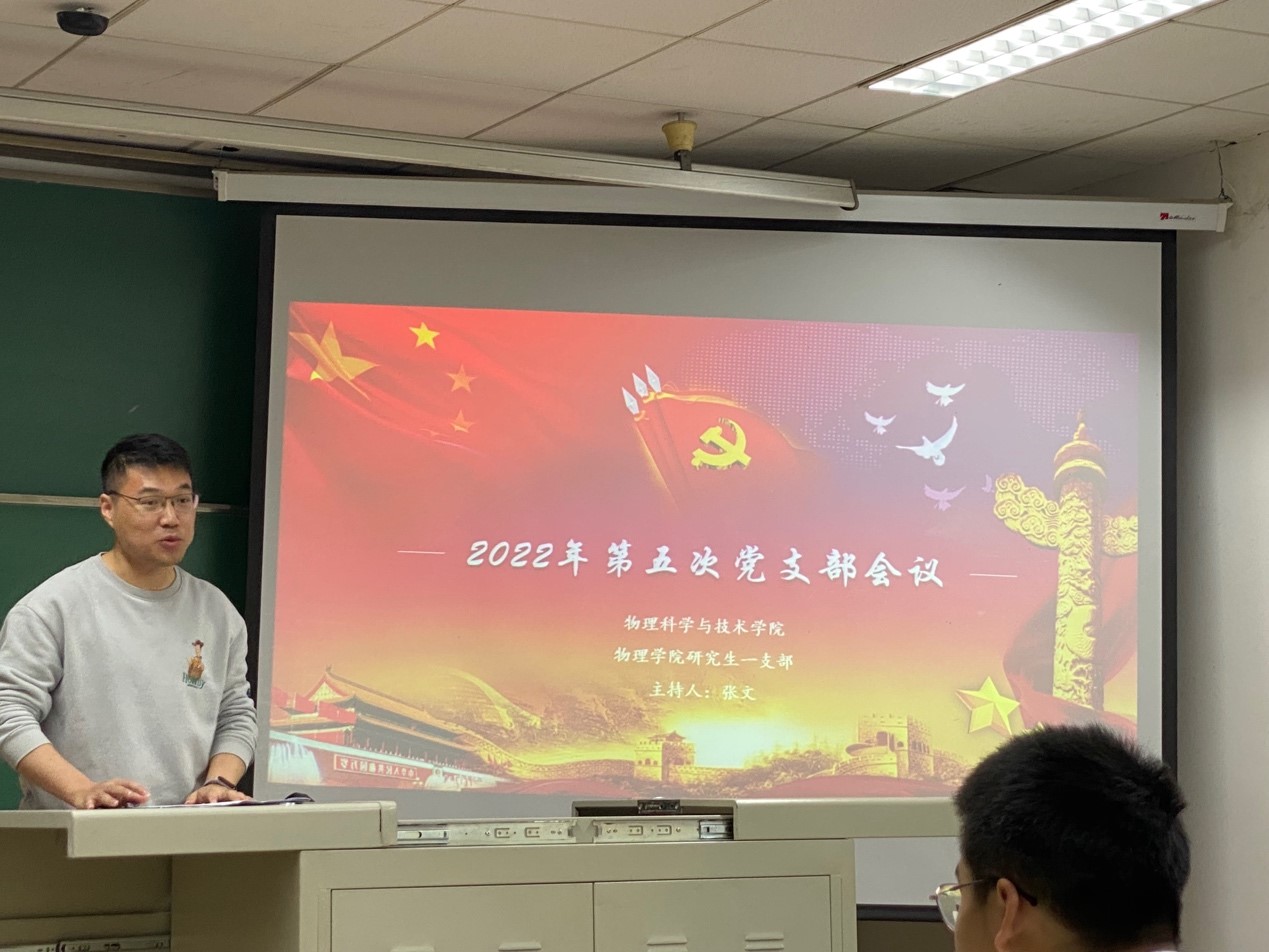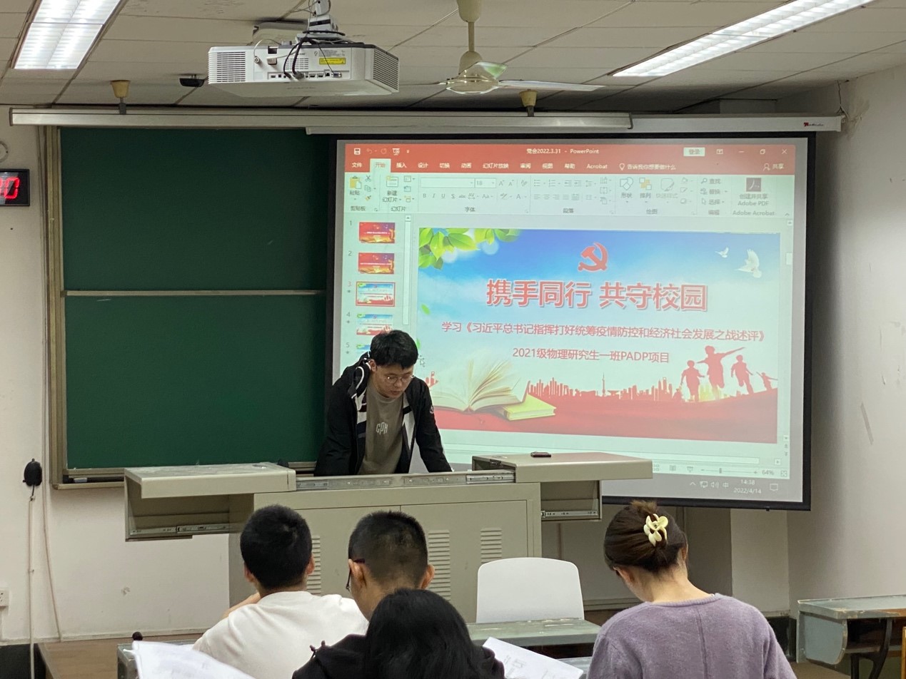 2022年4月14日14:30时,中共太阳成集团tyc122cc研究生一支部于九里校区4305B室开展了“携手同心 共守校园”主题党日活动, 物理研究生一支部全体支部党员参加了本次会议。会议由党支部副书记张文同志主持。