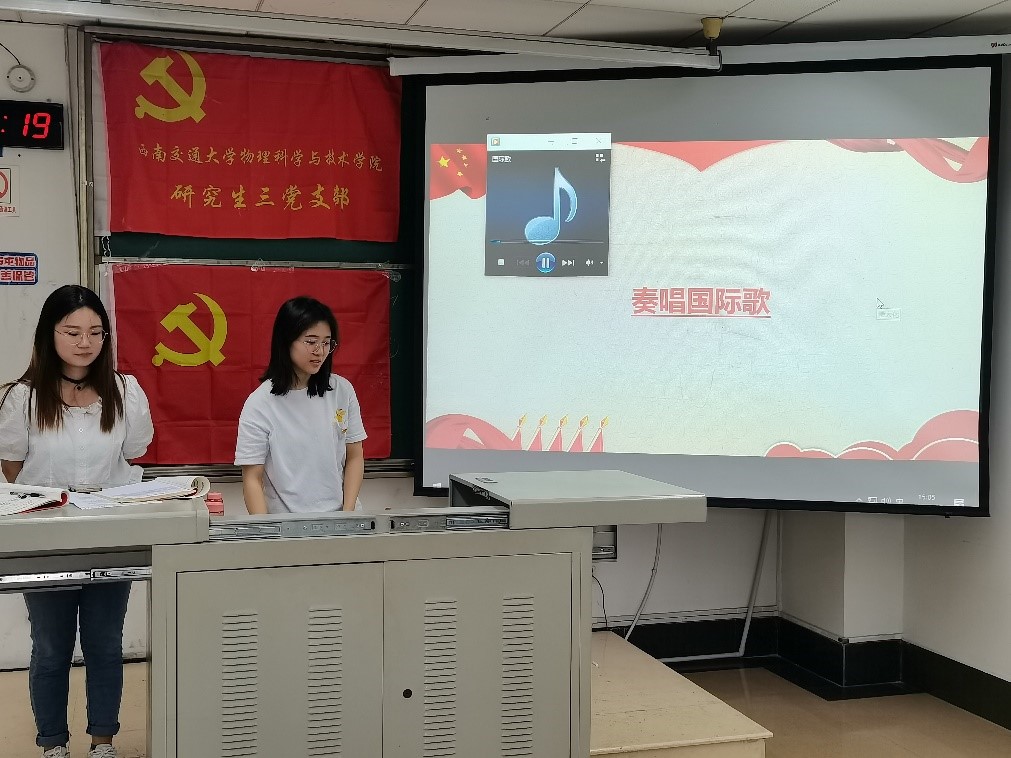 首先在党支部副书记钟佳丽同志的组织下,全体党员、发展对象起立奏唱国际歌。