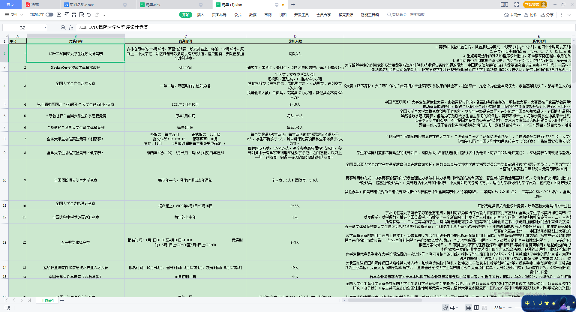 全体发展对象在党支部书记郭畅同志的带领下共同整理统计一份帮助大家融入和了解大学竞赛生活的竞赛清单。清单内容包括各项竞赛名称、举办时间、参加人数、竞赛简介以及报名网址等相关信息。同学们紧密配合,经过两个多小时的实践,完成这份竞赛清单,至此本次实践活动顺利完成。