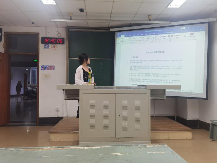 最后,张燕青副书记宣读了研究生四党支部管理规定。该规定结合学院与支部的实际情况,经过四支部支部委员会的讨论与修订形成最终稿件,强调了开会制度、请假制度、生活管理条例、处分条例,大家共同遵守,建设更好的党支部。