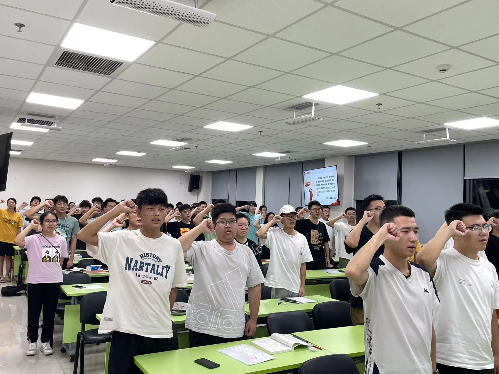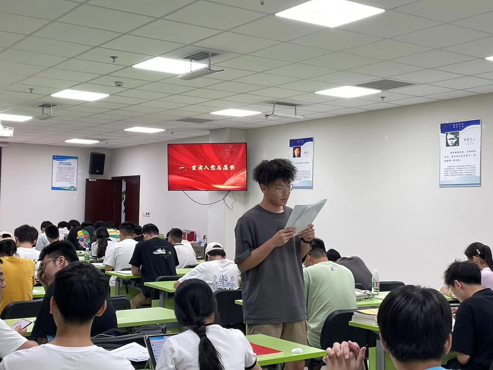 罗宇涵、李燕冰、刘希睿等26位同志现均已通过党组织层层考核,根据党支部研究意见,今召开接收大会,讨论接收26位同志为中共预备党员问题。26位发展对象按照顺序,依次上台进行个人自我介绍、入党动机阐述、入党志愿书宣读,经支部审查,26位发展对象均满足预备党员接收条件。