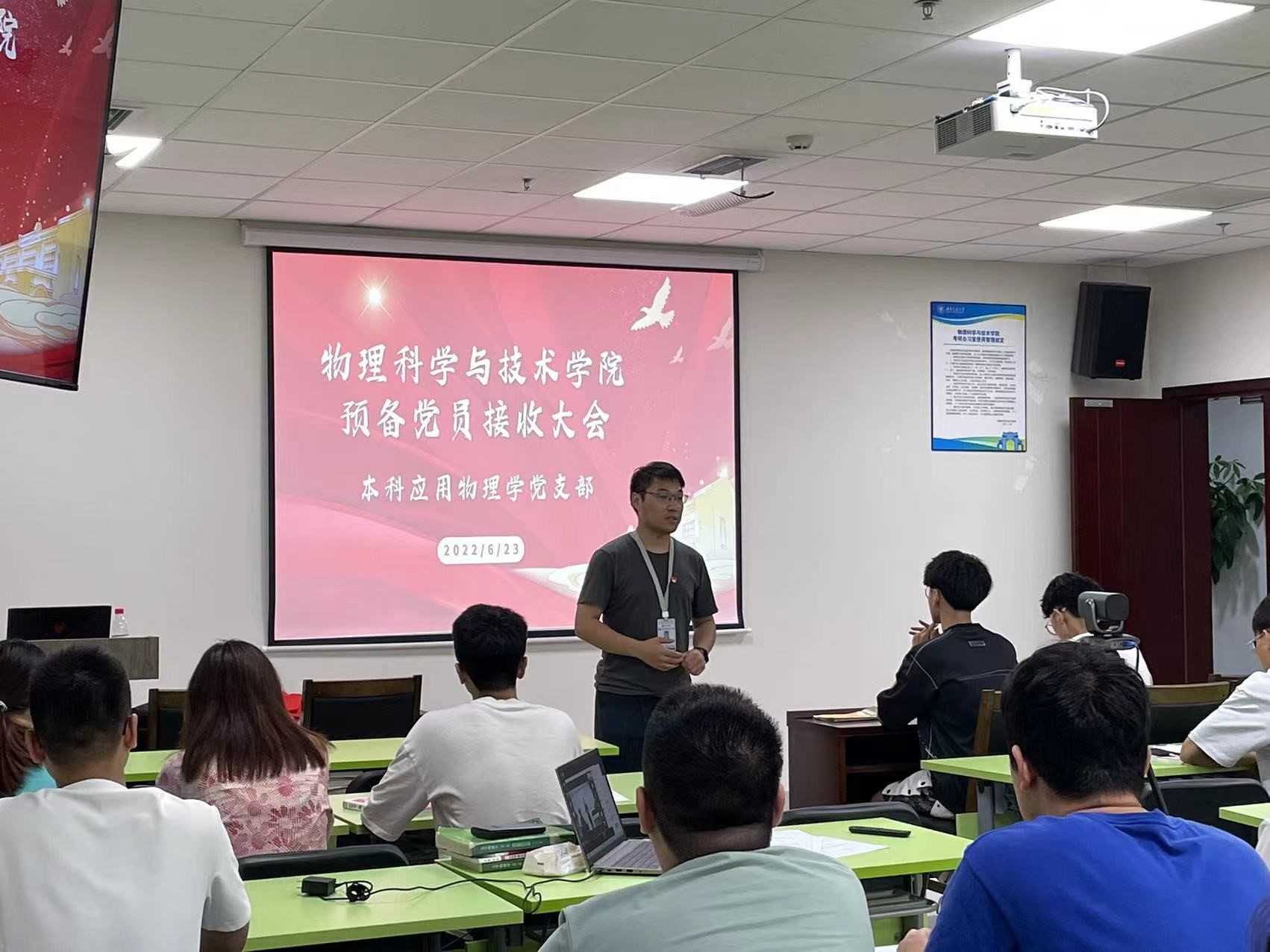 2022年6月23日晚7点30,本科应用物理学党支部召开了“预备党员接收大会”。本次会议在犀浦校区X30334召开,党建工作室指导老师杨昊戬及支部全体党员及发展对象出席了本次会议,会议由支部副书记张柏森同志主持。