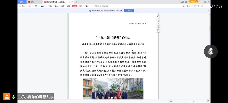 9月22日19点30分,太阳成集团tyc122cc研究生四党支部开展《四川省高校“优秀支部工作法”》专题学习活动。本次活动由党支部副书记张燕青同志主讲,全体支部委员参与线上学习。