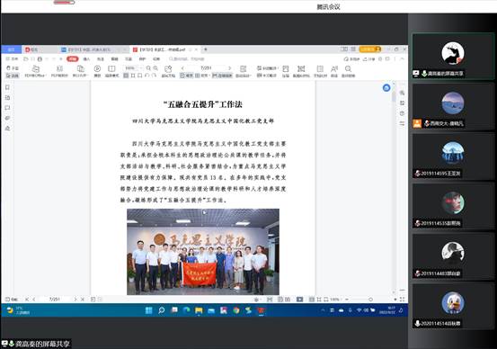 接下来,支部共同学习“四川省优秀支部工作法”,龚高秦老师重点讲解“五融合五提升”工作法,通过展示优秀示例,在党建工作与公司产品、党建工作与社会服务、党建工作与文化涵育等方面对支部支委与支部党员提出更高的要求。第一要发挥好党员的示范带头作用,比如观看“学习强国”提升自我,为同学们开展课业上的疑难讲解;第二要提升党支部的活力和创造力,铸造属于自己的支部特色与文化内核。