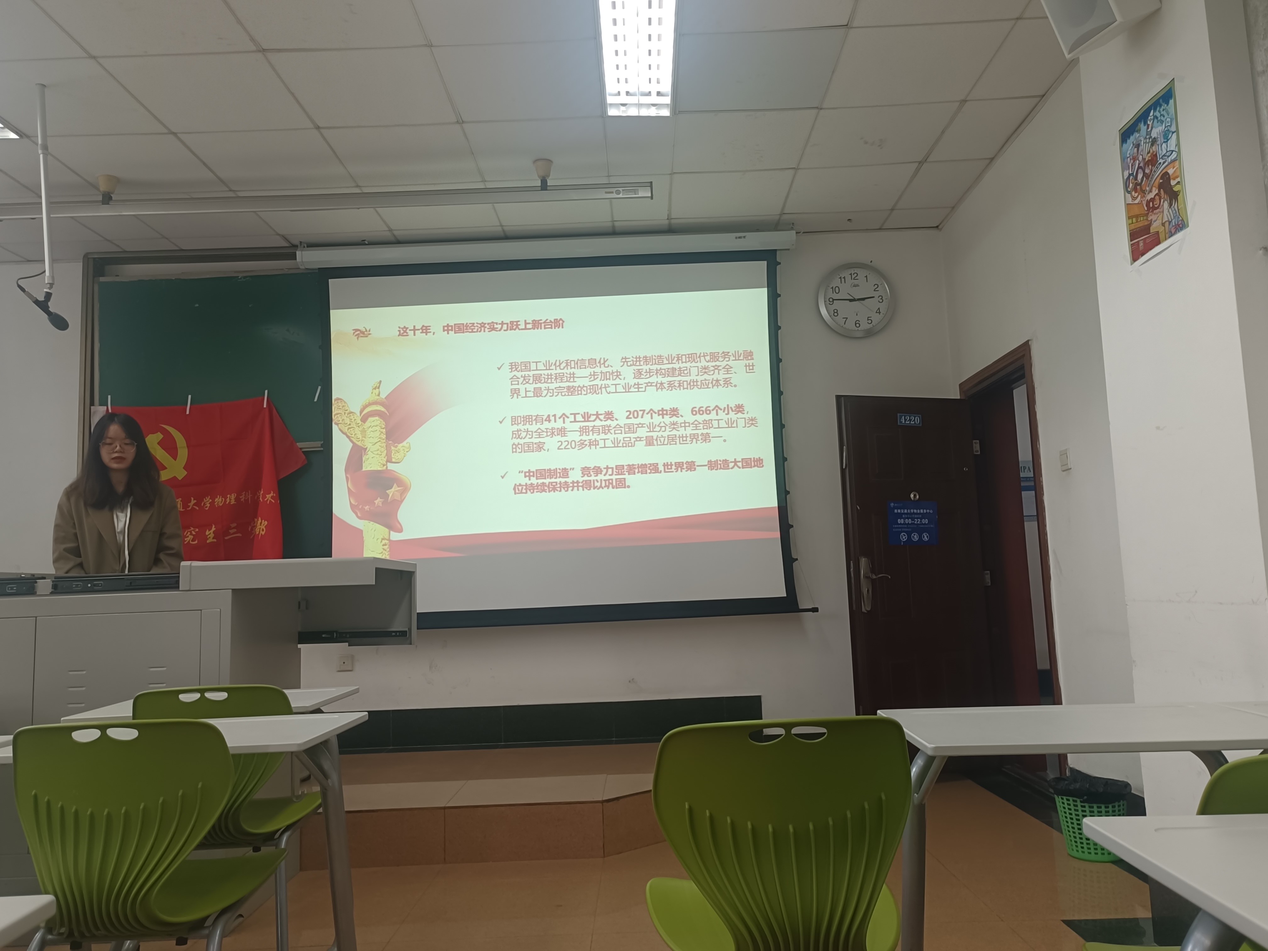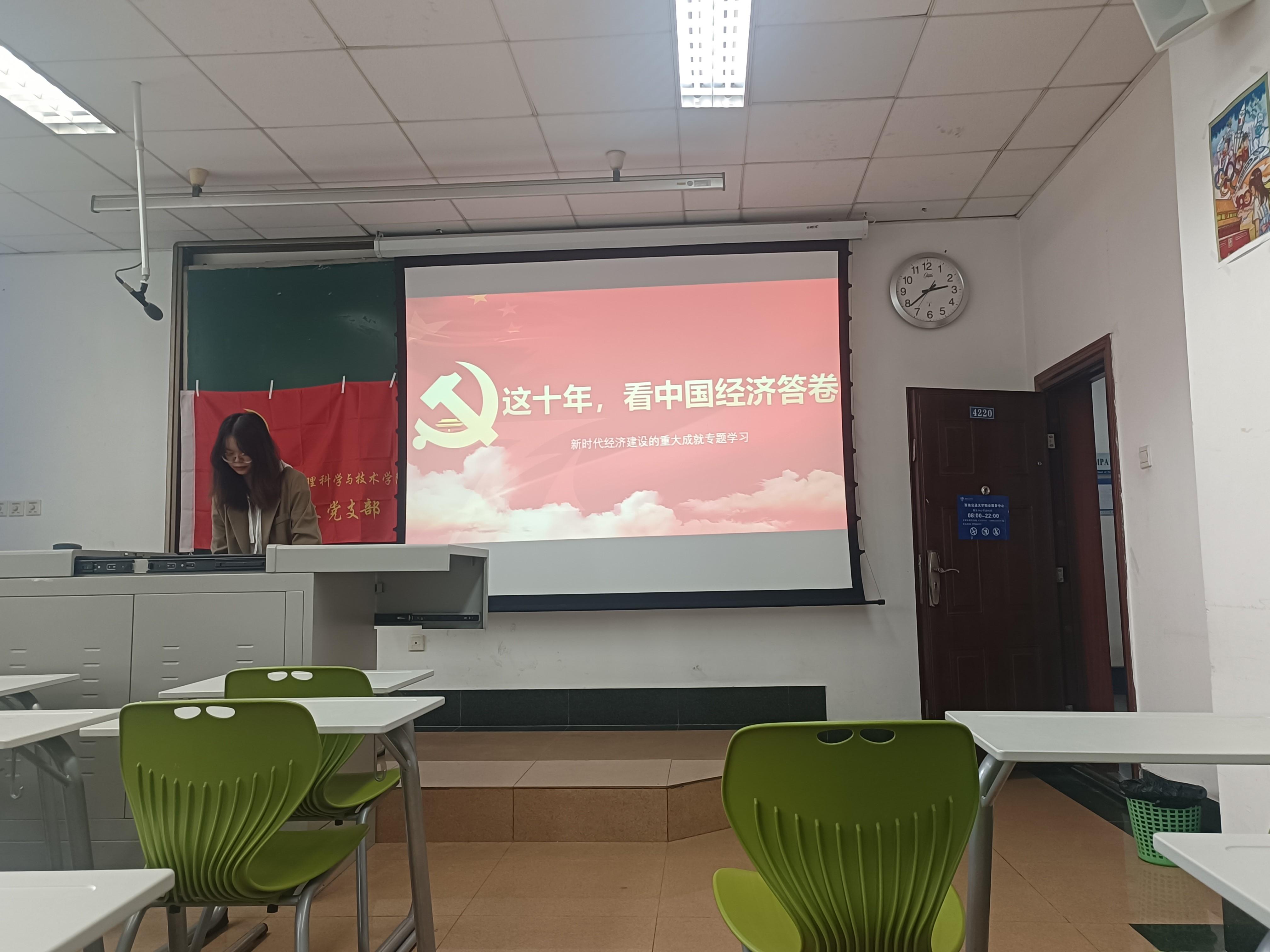 首先钟佳丽代表党支部对研一的新党员同志们表示热烈欢迎,研究生一年级的新党员同志们也轮流进行了自我介绍。然后,周恒安同志对为什么选取该主题做了阐述,说明了经济建设的重要意义。之后,她带领支部党员观看了一段名为“2021-2022,我们这十年特别策划”的视频,在场党员同志受益匪浅。