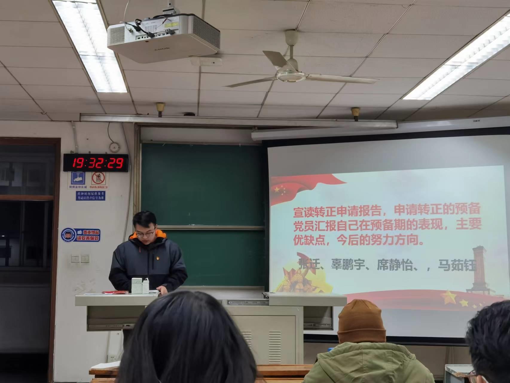 首先,预备党员张迁、辜鹏宇、席静怡、马茹钰四位同志依次宣读《转正申请书》,分别从思想、学习、工作等各方面进行汇报。此外,马茹钰同志宣读了不在校期间的学习情况说明,对该同志在工作岗位上,参与党组织活动,党的思想理论等学习情况进行了说明。