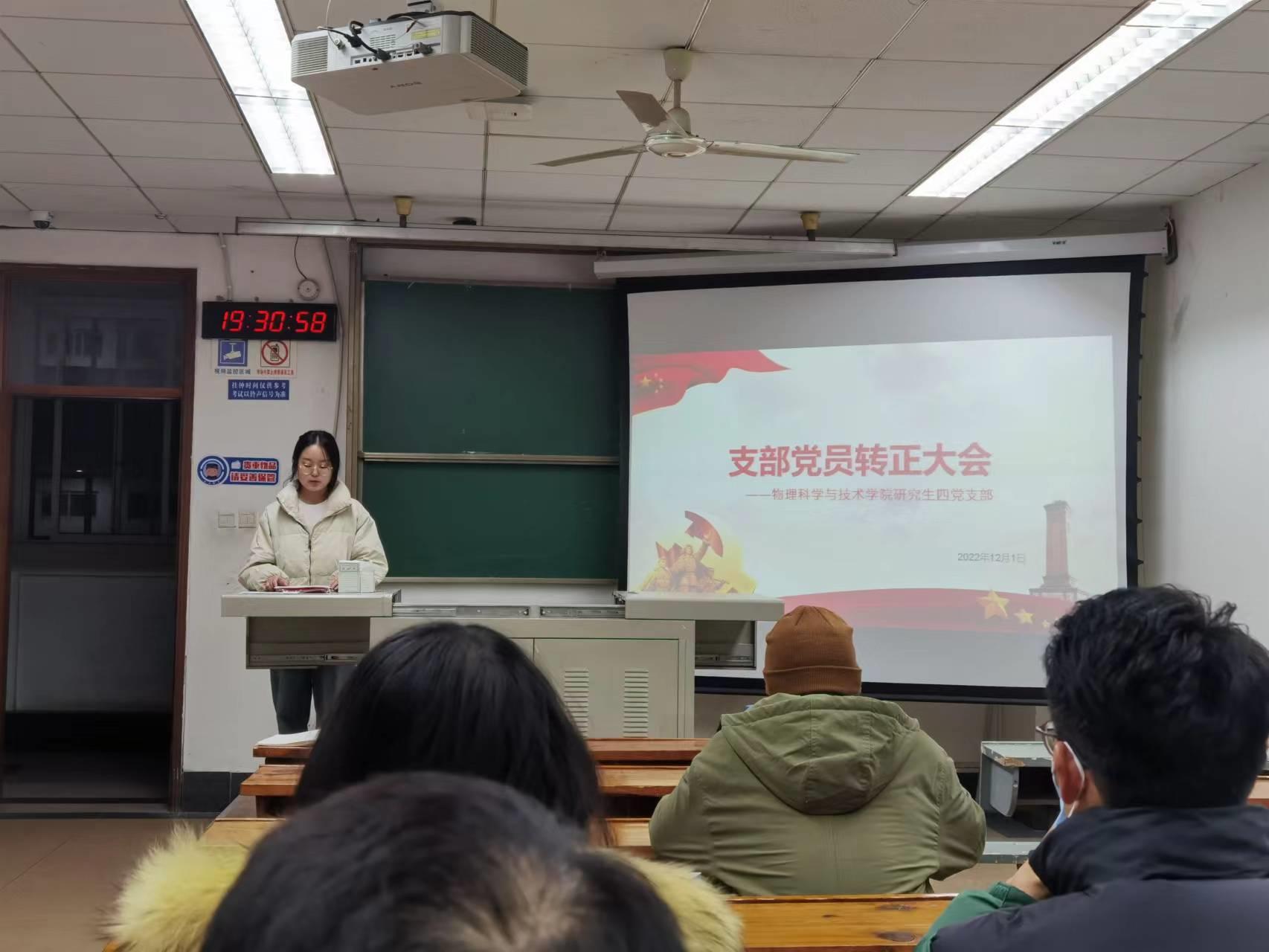 12月1日19点30分,太阳成集团tyc122cc研究生四党支部在4号教学楼4304B教室召开预备党员转正大会。本次会议由党支部副书记张燕青同志主持,主要内容是审议、讨论及表决是否同意张迁、辜鹏宇、席静怡、马茹钰四位同志转为正式党员。会议应到与会有表决权的正式党员14人,因事因请假2人,实到12人,符合会议召开要求。