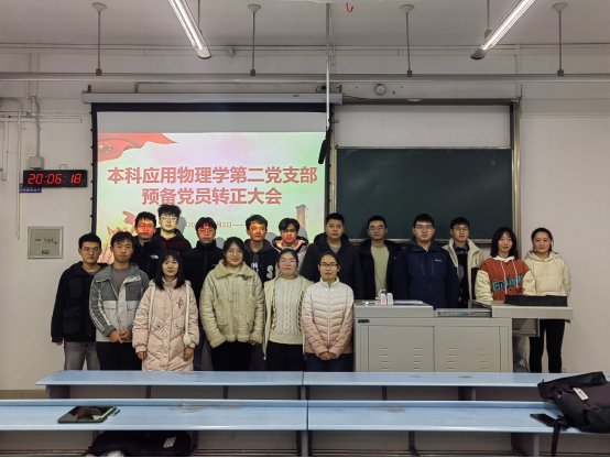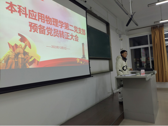 2022年12月2日晚7点30,本科应用物理学第二党支部召开预备党员转正大会,本次会议在犀浦校区X2535召开,由党支部副书记张柏森同志主持,党支部全体党员出席会议。