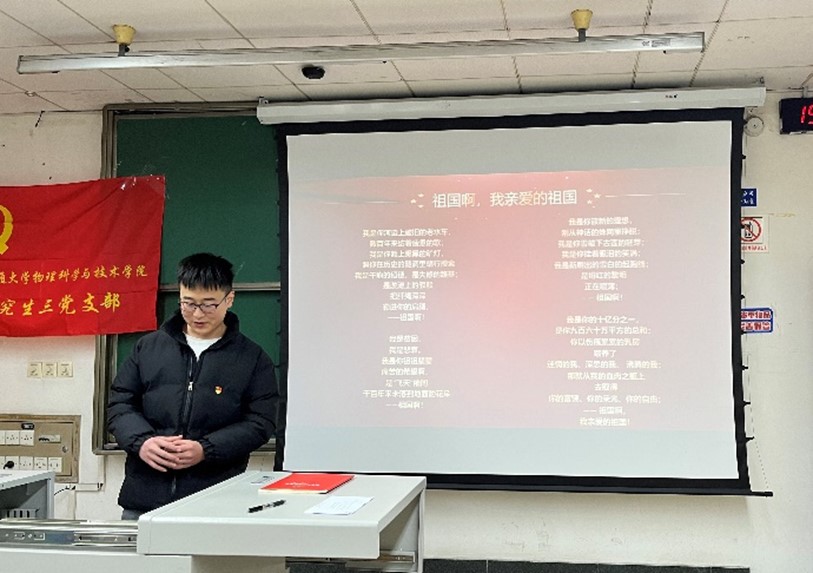 最后,孙海龙同志向全体党员同志分享了《沁园春·雪》、《祖国啊,我亲爱的祖国》、《映山红》等红色歌曲和诗歌,共同聆听以及共同阅读,一起体会往年的峥嵘岁月,分享者对歌曲或者诗歌的创作背景进行了讲述和分享,红色文化是党的生命之魂、生存之根、发展之本,支部成员可以用红色文化“补钙壮骨”。