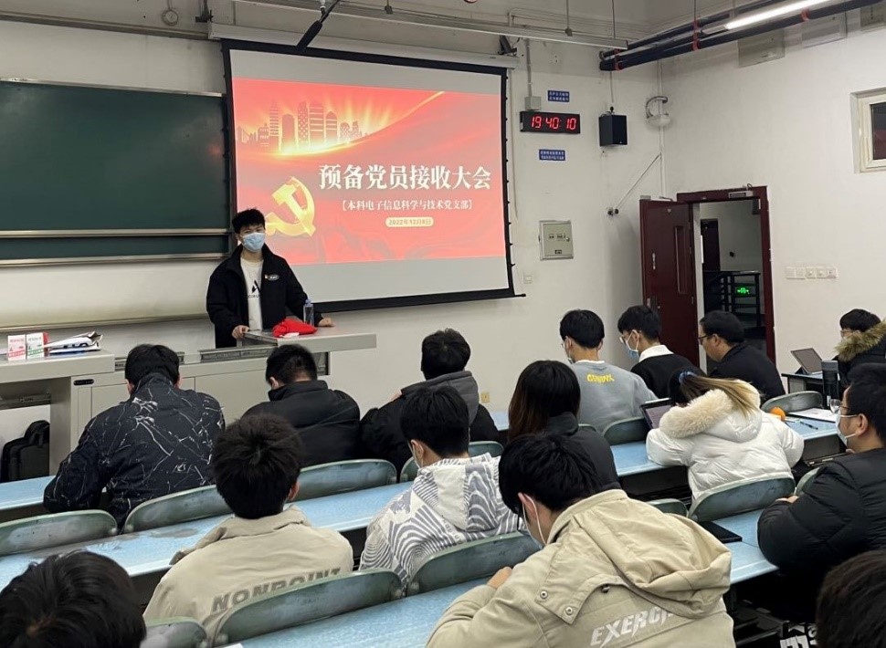 2022年12月8日下午7点30分,本科电子信息科学与技术党支部于X2326教室召开预备党员接收大会,会议由支部书记郭畅主持,全体支部成员及2022-02期发展对象参加。大会应到正式党员15名,实到正式党员15名,实到有表决权的正式党员15名,符合预备党员接收大会规定要求。