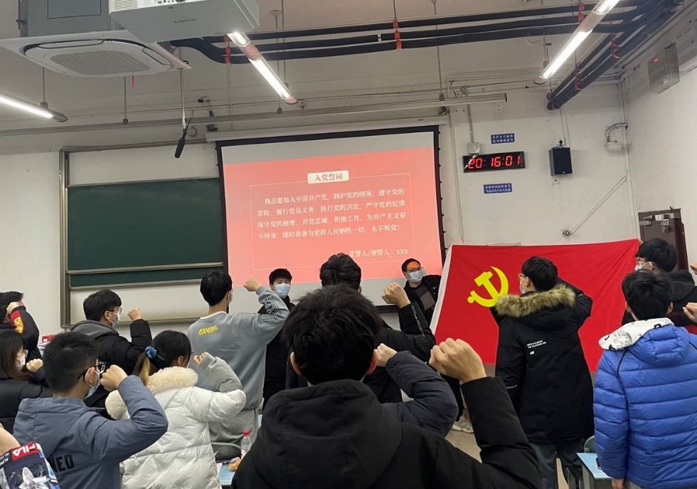 最后,支部书记郭畅带领各位支部成员进行了入党宣誓。他对新接收的预备党员们表示祝贺,并提出严格的要求和殷切的希望。希望各位新党员能够不忘入党初心,坚定理想信念,加强党性修养,提高自身学习能力,发挥党员的模范带头作用,在学院建设和发展中,向不断输出正能量,肩负起新时代新使命!
