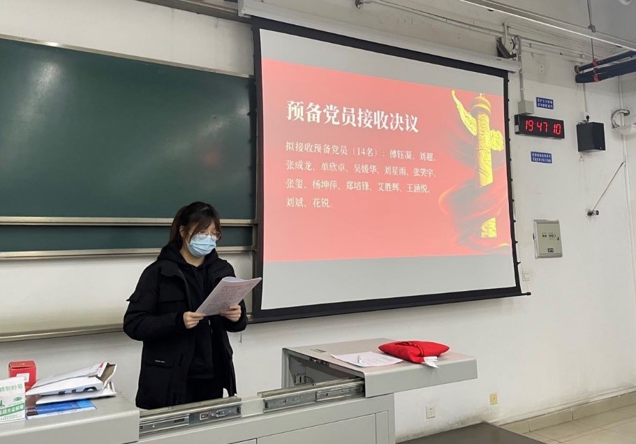 根据《中国共产党章程》及《中国共产党发展党员工作细则》,支部大会按照程序讨论了傅钰凝等14位发展对象的入党事宜。会议开始,由14位发展对象依次宣读了自己的《入党志愿书》,向大会汇报了自己对党的认识、入党动机、现实表现及个人履历等。宣读结束后回答了党史相关问题,展现了共产党员对党的相关理论知识应知应会的素养。