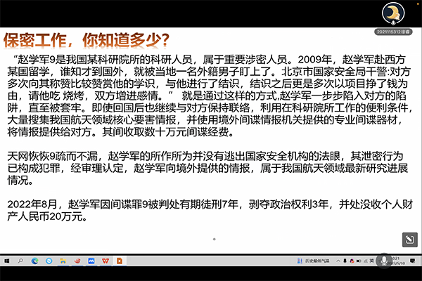 2023年5月8日10时,为更好学习贯彻保密宣传教育,21级应用物理六班17名成员在团支书徐睿的组织下于线上开展关于“传达贯彻保密宣传意识”的主题团日活动。