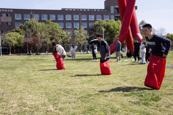 第三,第四个游戏则分别为“袋鼠也疯狂”和“暗中衔接”一个需要比赛人员套袋跳接力,另一个队员在起始者50米外等待接力,共八人接力,用时短的队伍获胜;另一个则需要三人配合,一人背对投球,一人接球,另一个人捡球,一分钟内接球多的队伍获胜。在前两轮游戏各个队伍成员之间的磨合下,第三、第四个游戏队伍各成员发挥得要更加出色些,人人都在感受欢乐,人人都在衔接快乐。