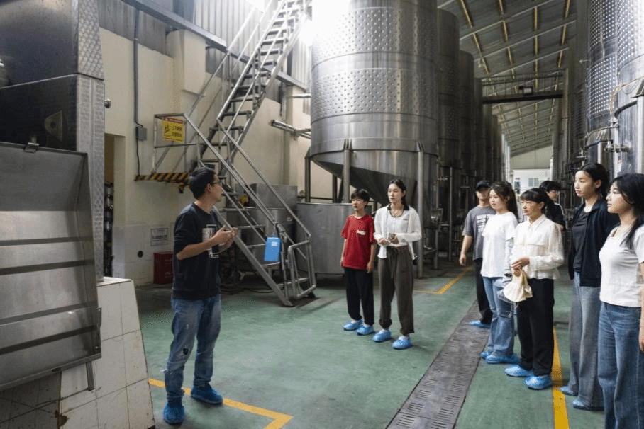 在酿造车间,专业师傅展示了葡萄酒的机械化生产全过程,团队了解到种植、管理、采摘、筛选、加工等十几道工序,一体化的制造过程,体悟到现代科技与传统技艺的有机结合的科技力量。