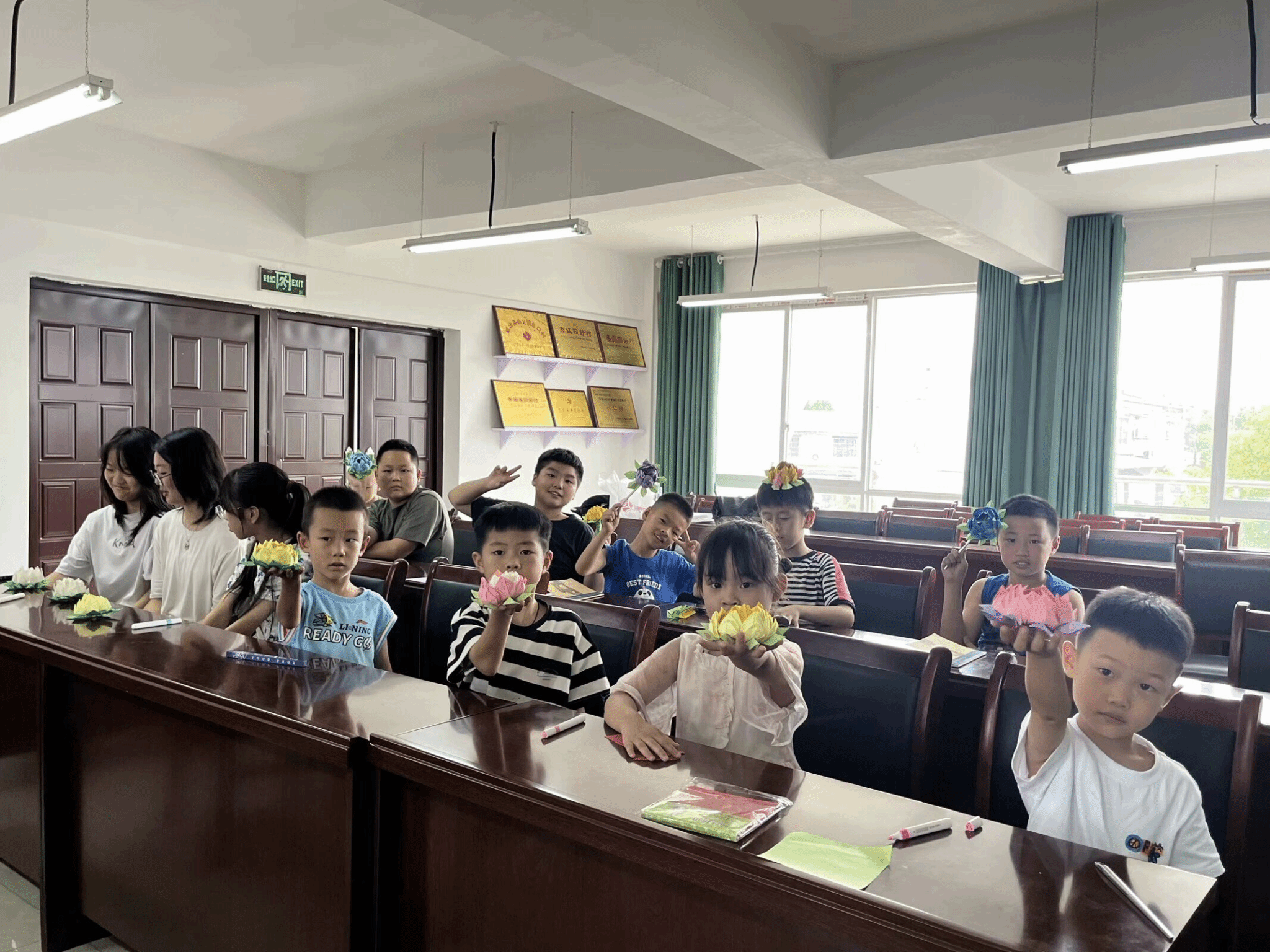 为培养孩子们的动手能力和创新思维,实践队员们教授孩子们如何自己动手折出有自己独特风格的莲花,孩子们可以发挥自己的想象力,这朵莲花既可以为纯色,亦可将所有颜色合为一体。实践队员先整体介绍莲花的折法,再手把手教孩子们如何折出漂亮的荷花,确保每个孩子都能亲手折出自己的荷花。通过老师折叠出的五彩莲花,孩子们各有各的想法,在这个过程中小朋友有的折出高洁的白莲花,有的则另辟蹊径折出让人眼前一亮的莲花帽。实践队员希望在这炎炎夏日,这朵荷花可以带给水口村孩子们一缕凉爽的同时培养他们的想象创造能力。