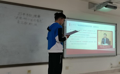 团课开始时,同学们在团支书蒋肖传睿的带领下学习团歌并齐声演唱。接下来,团支书分三个板块为同学们详细介绍了“成渝地区双城经济圈”的面貌。