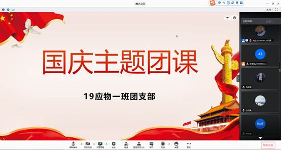 10月1日下午两点,2019级应物一班通过腾讯会议平台开展秋季学期第一堂团课。本次团课由团支部书记关欣主讲,围绕抗击新冠肺炎疫情的斗争中所展现的中国精神进行讲述。面对来势汹汹的新冠肺炎疫情,14亿中国人民上下同心、团结协作、顽强斗争,充分发扬伟大的中国精神,凝聚起众志成城抗击疫情的强大精神力量。本次团课以“爱国”为核心思想,以线上的模式,将大家连接在一起。