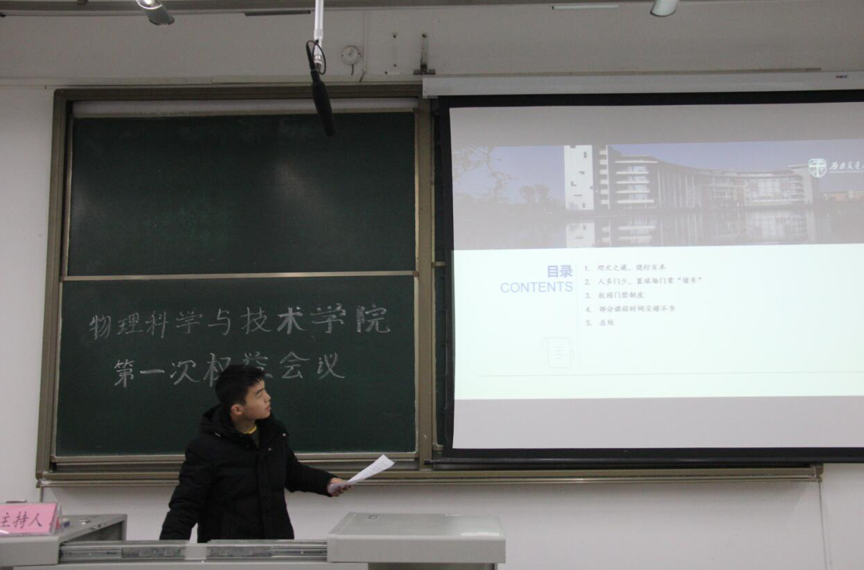 最后是权益委员提案汇报决议环节,共有七位代表不同年级和班级的权益委员上台发言,同学们根据班级同学反馈的问题来进行汇报,并给出相应的建议,权益委员们通过预提案决议表进行决议。通过预提案与提案决议相结合的形式,权益部收集到了更加表达出物理学子心声的意见和建议,从而来很好地进行权益工作。会后对预提案和决议表进行回收,整理形成提案上报学院及校青年之声。