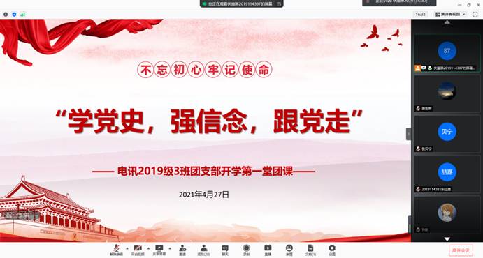 2021年4月27日晚8:00,2019级电讯三班全体同学在腾讯会议线上开展了2021年第一次团课。本次团课的主题为“学党史、强信念、跟党走”,由团支书伏惠琳主讲。