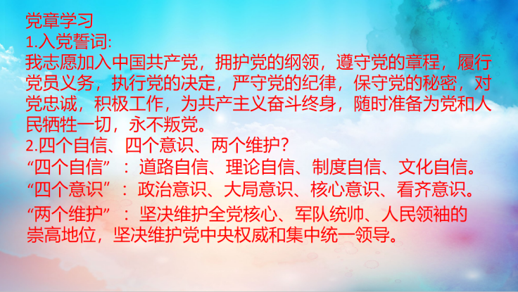 然后,团支书蒋肖传睿与同学们共同对党章知识进行了学习。习近平总书记曾在讲话中强调,必须增强“四个意识”,坚定“四个自信”,做到“两个维护”。这也正体现出三者的重要性,需要大家认真学习并落实到位。