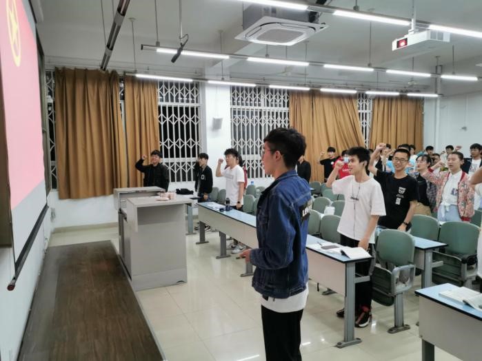 此次主题团课的第一个流程,由团支书蒋肖传睿带领大家重温入团仪式。此项议程给大家带来了深刻的印象,仿佛将过去的那段记忆重现眼前。记忆中当年还是初中生的我们第一次在团旗下庄严宣誓,第一次在胸口处佩戴上团徽,那时的心中充满了强烈的自豪感。