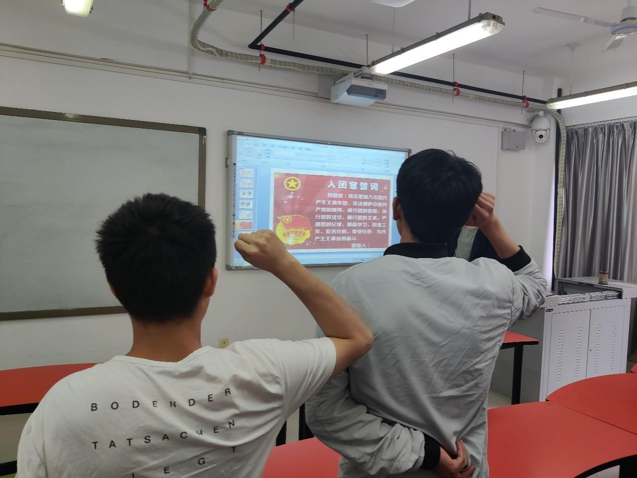 随后,团支书简单介绍了共青团的发展光辉历程,以及共青团的性质和职能。为了让团员铭记作为共青团员该有的担当与责任,团支书带领同学们再次了解了团徽和团旗,学习团的章程,并重温了入团仪式。