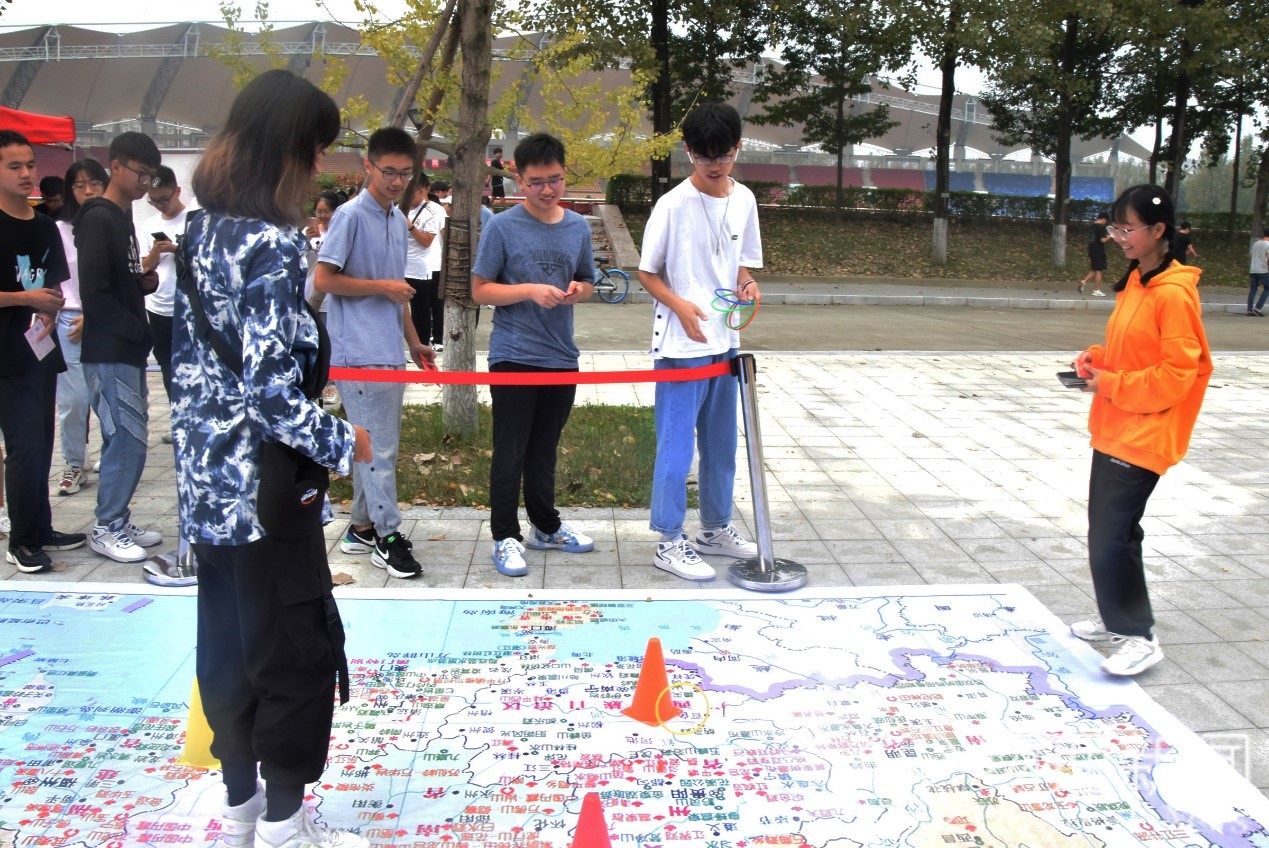 第三项活动点以“改革开放”为主题,活动点的地面上铺设着两张中国地图,在各个经济特区上摆放了锥形桶,老师同学们需用圆环套住这些锥形桶。套圈游戏吸引了大量的同学尝试,来往的老师同学们络绎不绝。同时,完成游戏后,同学们也对经济特区有了更深刻的了解。