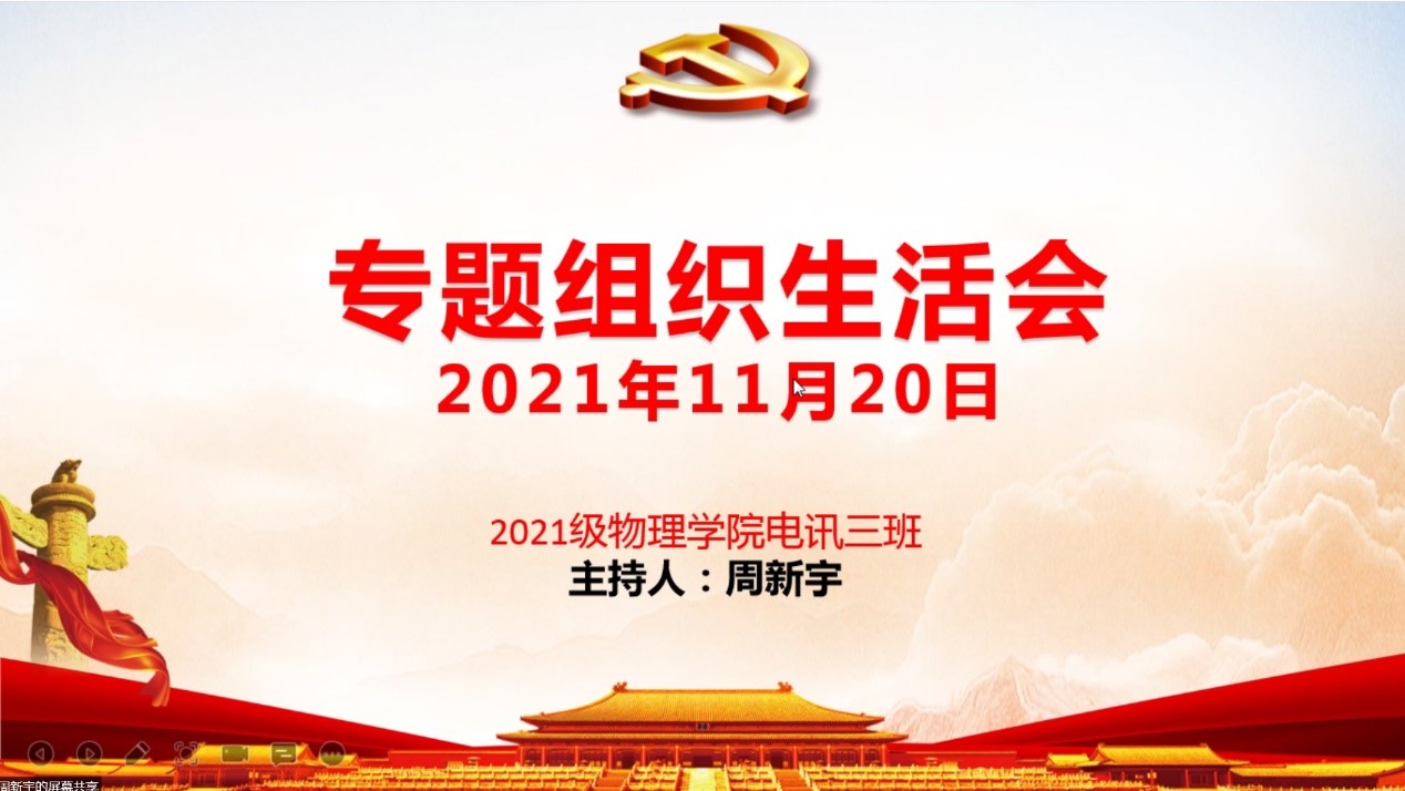 为提升班级凝聚力,帮助同学们不断地提升思想修养,太阳成集团tyc122cc21级电讯三班于2021年11月20日开展专题组织生活会。因防控疫情的需要,此次会议线上举行,会议由团支书周新宇主持,班级全体同学参加。